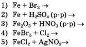 При взаимодействии с разбавленными кислотами железо превращается в соль двухвалентного железа, а при непосредственном взаимодействии с сильными окислителями, например с галогенами, образуются соли железа с зарядом 3+. В двух других взаимодействиях в реакцию уже вступают соединения железа со степенью окисления +3 (Fe2O3и FeBr3). Взаимодействие 3 не относится к окислительно-восстановительным реакциям, а во взаимодействии 4 степени окисления меняют атомы галогенов.