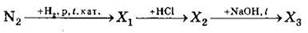 Проследим за превращениями, происходящими в предложенной последовательности реакций. На первом этапе при взаимодействии азота и водорода образуется аммиак (NH3). В результате взаимодействия аммиака и хлороводорода образуется продукт Х2 — NH4Cl (хлорид аммония — 5). А при сплавлении хлорида аммония со щелочью образуется NH3 (аммиак — 2) и NaCl (хлорид натрия).