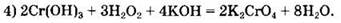 На завершающем этапе цепочки превращений образовавшийся осадок обработали пероксидом водорода, который, проявляя окислительные свойства, повышает степень окисления хрома с +3 до +6. Предположим, что продуктом реакции может быть хромат или дихромат калия. Но так как в условии есть указание на участие в реакции гидроксида калия, т.е. щелочной среды, продуктом реакции будет хромат калия.