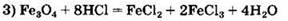 Именно такой состав железной окалины и определяет продукты, образующиеся при ее взаимодействии с соляной кислотой: будут образовываться два хлорида — хлорид железа (II) и хлорид железа (III):