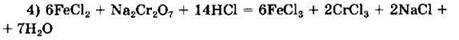 Воздействие на полученную смесь сильного окислителя — дихромата калия в кислой среде — приводит к повышению степени окисления железа с +2 до устойчивой +3 и понижению степени окисления хрома с +6 до +3. А указание на наличие в растворе соляной кислоты подсказывает нам, что будут образовываться хлориды металлов, участвующих в реакции: