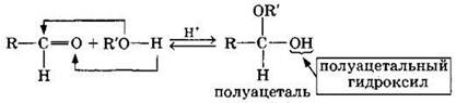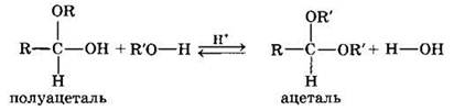 Взаимодействие полуацеталя с еще одной молекулой спирта (в присутствии кислоты) приводит к замещению полуацетального гидроксила на алкоксильную группу OR и образованию ацеталя:
