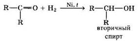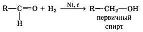 Альдегиды при взаимодействии с водородом в присутствии Ni-катализатора образуют первичные спирты, кетоны — вторичные: