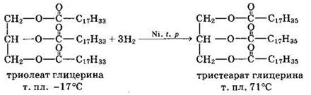 Жидкие жиры превращают в твердые путем реакции гидрогенизации (гидрирования). При этом водород присоединяется по двойной связи, содержащейся в углеводородном радикале молекул масел.