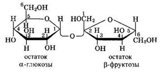 Примером наиболее распространенных в природе дисахаридов является сахароза. Молекула сахарозы состоит из остатков глюкозы и фруктозы, соединенных друг с другом за счет взаимодействия полуацетальных гидроксилов (1→2)-гликозидной связью: