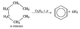 а) дегидроциклизация (дегидрирование и циклизация) алканов, содержащих в основной цепи не менее 6 атомов углерода, при нагревании в присутствии катализатора
