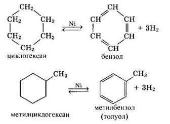 б) дегидрирование циклоалканов, содержащих в цикле 6 углеродных атомов.