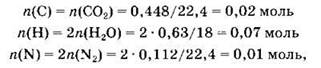38. При сгорании 0,45 г газообразного органического вещества выделилось 0,448 л (н.у.) углекислого газа, 0,63 г воды и 0,112 л (н.у.) азота. Плотность исходного газообразного вещества по азоту 1,607. Известно, что при взаимодействии с азотистой кислотой органическое вещество образует спирт.