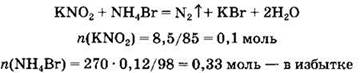 33. Нитрит калия массой 8,5 г внесли при нагревании в 270 г раствора бромида аммония с массовой долей 12%. Какой объем (н.у.) азота выделится при этом и какова массовая доля бромида аммония в получившемся растворе?
