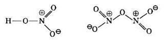 Поскольку во втором энергетическом (квантовом) слое нет вакантных орбиталей, то атом азота не может расспарить 2s2-электронную пару и повысить свои валентные возможности. Таким образом, атом азота может проявлять валентности I, II, III и IV, но не V! Азот не может быть пятивалентным! Даже в азотной кислоте и своем высшем оксиде атом азота образует только четыре ковалентные связи, являясь четырехвалентным, что видно из следующих структурных формул: