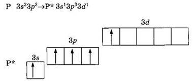 Как и азот, фосфор может проявлять валентности I, II, III и IV. Но, так как для элементов третьего периода доступны вакантные 3d-орбитали, атом фосфора может перейти в возбужденное состояние, переведя один из s-электронов на d-подуровень: