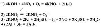 Пример 27. Смесь оксида азота(IV) и кислорода пропустили через раствор гидроксида калия. Полученную при этом соль высушили и прокалили. Остаток, полученный после прокаливания соли, растворили в воде и смешали с раствором иодида калия и серной кислотой. Образовавшееся в ходе этой реакции простое вещество прореагировало с алюминием.