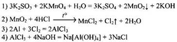 Пример 30. При сливании водных растворов сульфита калия и перманганата калия выпал осадок. Осадок при нагревании обработали концентрированной соляной кислотой, при этом наблюдалось образование газа. Полученный газ прореагировал с алюминием. Продукт данной реакции растворили в избытке раствора гидроксида натрия.