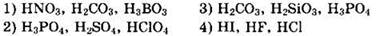 В ряду HNO3, Н2СО3, Н3ВО3 сила электролитов постоянно ослабевает. В ряду Н3РO4, H2SO4, НСlO4 сила электролитов постоянно возрастает. В ряду Н2СO3, H2SiO3, Н3РO4 сила электролитов сначала ослабевает, потом возрастает. В ряду HI, HF, НСl сила электролитов сначала ослабевает, потом возрастает.