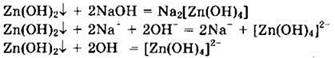 Решение 3. Ионные реакции идут в сторону образования осадков, газов, слабых электролитов или комплексных ионов. Гидроксид цинка реагирует с раствором гидроксида натрия, поскольку в ходе этой реакции образуется комплексное соединение тетрагидроксоцинкат натрия Na2[Zn(OH)4]. Это видно из соответствующих уравнений реакции: