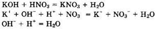 Решение 9. Наличие в сокращенном ионном уравнении ионов Н+ и ОН- указывает, что исходные кислота и основание являются сильными электролитами. Соединения КОН и HNO2 не подходят, поскольку HNO2 является слабым электролитом и в ионном уравнении записывается в виде молекулы HNO2, которой нет в сокращенном ионном уравнении. Аналогично не подходят ни соединения H2SO4 и Fe(OH)3, ни соединения HF и NaOH, поскольку Fe(OH)3и HF являются слабыми электролитами и записываются в ионных уравнениях в виде молекул. Соединения КОН и HNO3 являются сильными электролитами. Запишем уравнения реакции между ними и убедимся, что действительно получается требуемое сокращенное ионное уравнение: