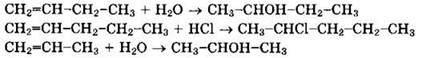 В бутене-2 СН3-СН=СН-СН3 атомы углерода при двойной связи равноценны, водород в равной степени присоединяется к каждому из них. Очевидно, что к реакциям гидрирования алкенов правило Марковникова не применимо. Реакции бутена-1 с водой (реакция 3), хлороводорода с пентеном-1 (реакция 4) и воды с пропеном (реакция 6) идут по правилу Марковникова: