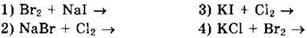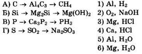 и кислородом 2Н2 + O2 = 2Н2O — ответ 3. В задании Б) бром не реагирует с Н3РO4, КВr, O2, N2, поэтому ответы 1, 2, 3, 5, 6 не подходят. Бром реагирует с иодидом калия Br2 + 2KI = 2КВr + I2 и с хлором Вr2 + Сl2 = 2ВrСl — ответ 4. В задании В) сера не реагирует с Н3РO4, КВr, С2Н4, KI, N2 — ответы 1, 2, 3, 4, 6 не подходят. Сера реагирует с кислородом при поджигании S + О2 = SO2 и железом при нагревании Fe + S = FeS — ответ 5. В задании Г) хлор не реагирует с Н3РO4(р-р), O2, Cl2, N2 — ответы 1, 3, 4, 5, 6 не подходят. Хлор реагирует с раствором бромида калия Сl2 + 2КВr = 2КСl + Вr2 и с фосфором при нагревании 2Р + 5Сl2 = 2PCl5 — ответ 2.