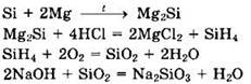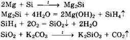 28. Кремний прокаливали с избытком магния. Полученное твердое вещество поместили в воду. Выделившийся газ самовоспламенился на воздухе. Образовавшееся при этом твердое вещество смешали с карбонатом калия и прокалили. Напишите уравнения четырех перечисленных реакций.