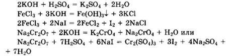 23. Даны водные растворы: дихромата натрия, хлорида железа(III), иодида натрия, серной кислоты и гидроксида калия. Напишите уравнения четырех возможных реакций между этими веществами.