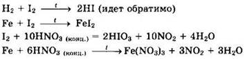 35. Даны вещества: водород, азотная кислота (конц.), железо, иод. Напишите уравнения четырех возможных реакций между этими веществами.