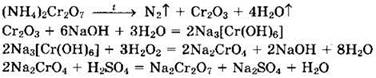 39. Дихромат аммония нагрели, проведя реакцию, напоминающую извержение вулкана. Образовавшееся зеленое вещество растворили в избытке раствора гидроксида натрия. К полученному зеленому раствору прибавили пероксид водорода. К образовавшемуся желтому раствору прибавили серную кислоту до получения оранжевого раствора. Напишите уравнения четырех перечисленных реакций.