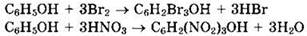 Решение 9. Гидроксильная группа фенола, являясь заместителем I рода, активирует электрофильные реакции замещения и направляет их в положения 2, 4, 6 (орто- и пара-положения). Реакции замещения в бензольном кольце идут легче, чем для бензола. Так фенол обесцвечивает бромную воду без катализатора с образованием 2,4,6-трибромфенола и нитруется до 2,4,6-тринитрофенола: