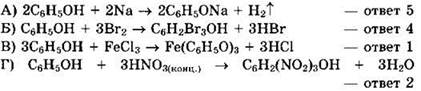 1) фенолят железа(III) 2) 2,4,6-тринитрофенол 3) 3,5-динитрофенол 4) 2,4,6-трибромфенол 5) фенолят натрия 6) реакция не идет |
