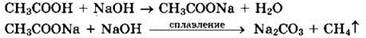 Решение 9. В уксусной кислоте два атома углерода, в метане — один атом углерода. Значит, имела место реакция укорочения цепи. Такая реакция идет при сплавлении солей карбоновых кислот с щелочами. Соль образуется при добавлении к кислоте раствора щелочи. Напишем уравнения реакций: