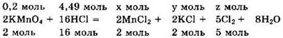 Для реакции с перманганатом калия нужно v(HCl) = 0,2 ∙ 16/2 = 1,60 моль, а имеется 4,49 моль. То есть соляная кислота в избытке, а перманганат калия реагирует полностью. Из уравнения реакции находим ![]()