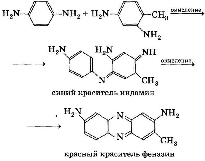 3.11. Химические красители для волос на основе n-фенилендиамина называют также окислительными, так как они приобретают окончательный цвет только после окисления, обычно под действием пероксида водорода. В качестве примера (не для запоминания) приводим схему образования красного красителя из смеси n-фенилендиамина и м-толуолдиамина: