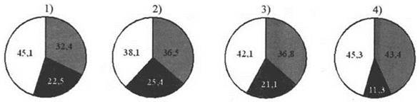 15. На какой диаграмме распределение массовых долей элементов соответствует количественному составу сульфита натрия?