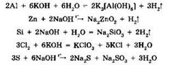 Следует также помнить, что щелочи могут реагировать с некоторыми металлами и неметаллами (окислительно-восстановительные реакции). При этом происходит или выделение водорода (если электроотрицательность элемента меньше электроотрицательности водорода), или диспропорционирование (в противном случае):