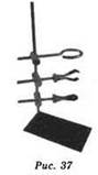 Для надёжного закрепления деталей или узлов приборов используют лабораторные штативы, снабжённые зажимными “лапками”, муфтами, кольцами (рис. 37).