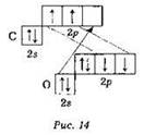 Атом углерода может образовать две ковалентных связи по механизму спаривания электронов (за счёт двух неспаренных электронов на р-подуровне) и ещё одну связь — по донорно-акцепторному механизму (является акцептором за счёт вакантной р-орбитали) (рис. 14).