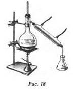 Дистилляция (ректификация) основана на различии в температурах кипения компонентов смеси. В лаборатории метод дистилляции используют для получения очищенной (дистиллированной) воды. Для этого воду перегоняют в установке, состоящей из нагреваемой колбы, снабжённой термометром, холодильника для конденсации водяных паров и приёмника очищенной воды (рис. 18).
