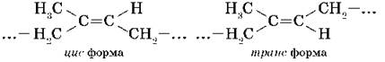Атомы углерода при двойной связи в каждом звене соединены с разными атомами (группами атомов). Поэтому здесь возможна геометрическая изомерия. Оказалось, что группы —CH2— в макромолекулах каучука расположены не беспорядочно, а по одну и ту же сторону двойной связи в каждом звене, т. е. находятся в цис-положении.