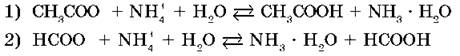 Например, рассмотрим гидролиз двух солей: ацетата аммония NH4CH3COO и формиата аммония NH4HCCO: