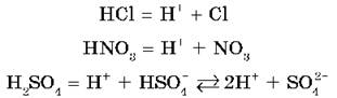 1. В воде кислоты диссоциируют на катионы водорода и анионы кислотных остатков, например: