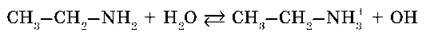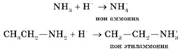 Амины как основания. Атом азота аминогруппы, подобно атому азота в молекуле аммиака, за счет неподеленной пары электронов может образовывать ковалентную связь по донорно-акцепторному механизму, выступая в роли донора. В связи с этим амины, как и аммиак, способны присоединять катион водорода, т. е. выступать в роли основания: