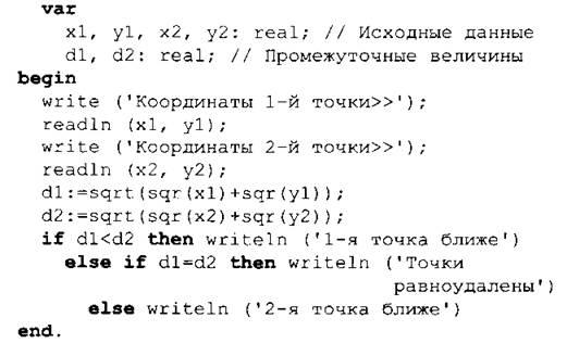 № 10. Здесь также важно понимание математической сути задачи. Можно предложить ученикам выполнить соответствующие построения в тетради и выяснить положение заданных точек относительно заданной прямой. После этого уже следует сформулировать общее правило и на его основании написать программу.
