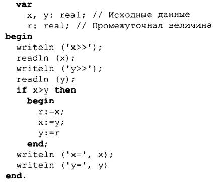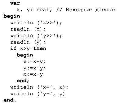 Для решения этой задачи можно запрограммировать и алгоритм обмена значениями числовых величин и без промежуточной переменной: