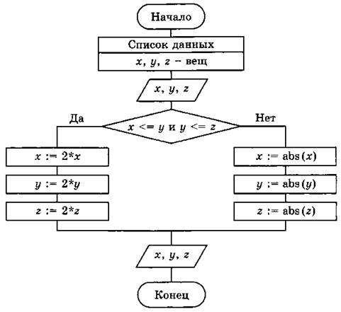 Ответ: если х ≤ у и у ≤ z, то исходные числа удваиваются, иначе определяются модули каждого числа.