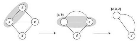 Алгоритм стягивания продолжает рекурсивно выполняться с G', случайно выбирая ребра (с равномерным распределением) и стягивая их. По мере продолжения рекурсии вершины G' должны рассматриваться как суперузлы: каждый суперузел w соответствует подмножеству S(w) ⊆ V, “поглощенному” в результате стягиваний, породивших w. Алгоритм завершается при достижении графа G', состоящего из двух суперузлов v1 и v2 (предположительно соединенных несколькими параллельными ребрами). Каждый суперузел vi имеет соответствующее подмножество S(vi) ⊆ V, которое состоит из стянутых в него узлов, и эти два множества S(v1) и S(v2) образуют разбиение V. Далее (S(v1), S(v2)) выводится как разрез, найденный алгоритмом.