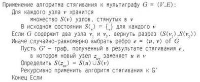 Алгоритм в (13.4) создает сильное впечатление, что нахождение глобального минимального разреза в ненаправленном графе в каком-то смысле является более сложной задачей, чем поискминимального разреза s-t в потоковой сети, так как нам приходится n - 1 раз вызывать процедуру для решения последней задачи в нашем методе для решения первой. Но оказывается, это всего лишь иллюзия. Серия все более простых алгоритмов, разработанных в конце 1980-х и начале 1990-х годов, показала, что глобальные минимальные разрезы в ненаправленных графах могут вычисляться так же эффективно, как разрезы s-t, и даже еще эффективнее, причем для этого не нужны ни улучшающие пути, ни даже концепция потока. Кульминационным моментом в этой области стало открытие Дэвидом Каргером в 1992 году алгоритма стягивания — рандомизированного метода, качественно более простого по сравнению со всеми предшествующими алгоритмами нахождения глобальных минимальных разрезов. В самом деле, алгоритм настолько прост, что на первый взгляд даже трудно поверить, что он действительно работает.
