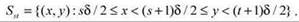 Проверка реализуется делением единичного квадрата (область, в пределах которой лежат точки) на подквадраты, стороны которых имеют длину δ/2, как показано на рис. 13.2. Всего будет N2подквадратов, где N = [1/(2δ)]: для 0 ≤ s ≤ N - 1 и 1 ≤ t ≤ N - 1 подквадрат Sst определяется по формуле