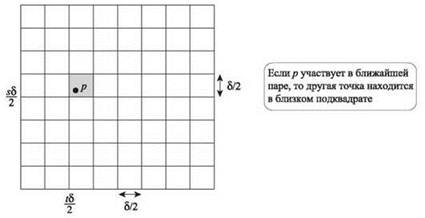 Основная идея алгоритма очень проста: он рассматривает точки в случайном порядке и поддерживает текущее значение δ для ближайшей пары в процессе обработки точек в этом порядке. Добравшись до новой точки р, алгоритм проверяет ее “окрестности”: не находятся ли какие-либо из ранее рассмотренных точек на расстоянии менее δ от р? Если таких точек нет, значит, ближайшая пара не изменилась, и алгоритм переходит к следующей точке в случайном порядке. Если существует точка, находящаяся от р на расстоянии менее δ, то ближайшая пара изменилась и информацию о ней нужно обновить.