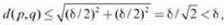 Доказательство. Если точки p и q находятся в одном подквадрате, то обе координаты двух точек отличаются не более чем на δ/2, а следовательно,