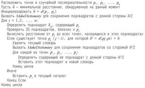 Затем, при рассмотрении следующей точки р в случайном порядке, определяется содержащий ее подквадрат Sst и выполняется операция Lookup для каждого из 25 подквадратов, близких к Sst. Для всех точек, обнаруженных этими операциями Lookup, вычисляется расстояние до р. Если ни одно из этих расстояний не меньше δ, то ближайшее расстояние не изменяется; мы вставляем Sst (вместе c р) в словарь и переходим к следующей точке.