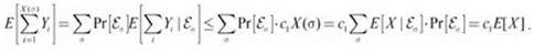 Пусть X — случайная переменная для обозначения количества операций Lookup, выполненных алгоритмом. Случайный порядок σ, выбранный алгоритмом, полностью определяет последовательность значений минимального расстояния, рассматриваемую алгоритмом, и последовательность выполняемых операций со словарем. В результате выбор σ определяет значение X; обозначим это значение Х(σ), а Eσ — событие выбора алгоритмом случайного порядка с. Заметим, что условное ожидание E[X | Eσ] равно Х(σ). Кроме того, из (13.31) известно, что E[Х] ≤ с0nдля некоторой константы с0.